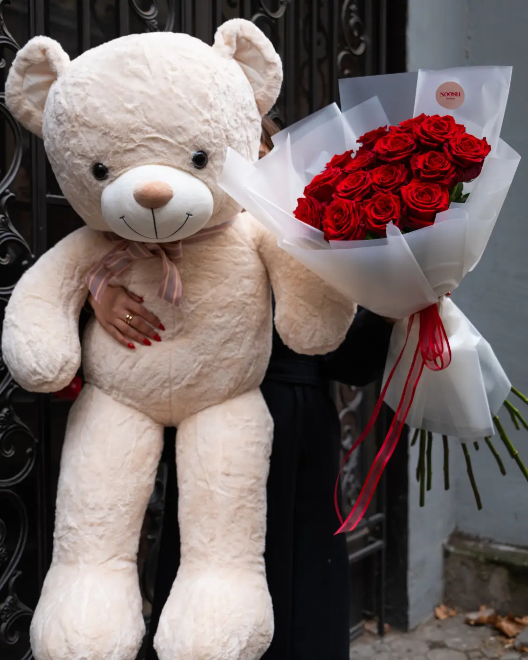 ვარდების თაიგული სათამაშო დათვით — ყვავილებისა და საყვარელი დეტალის იდეალური კომბინაცია, მზად საჩუქრად.